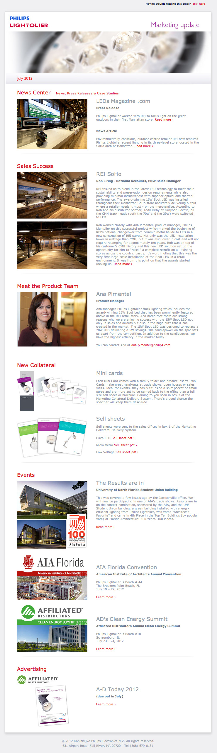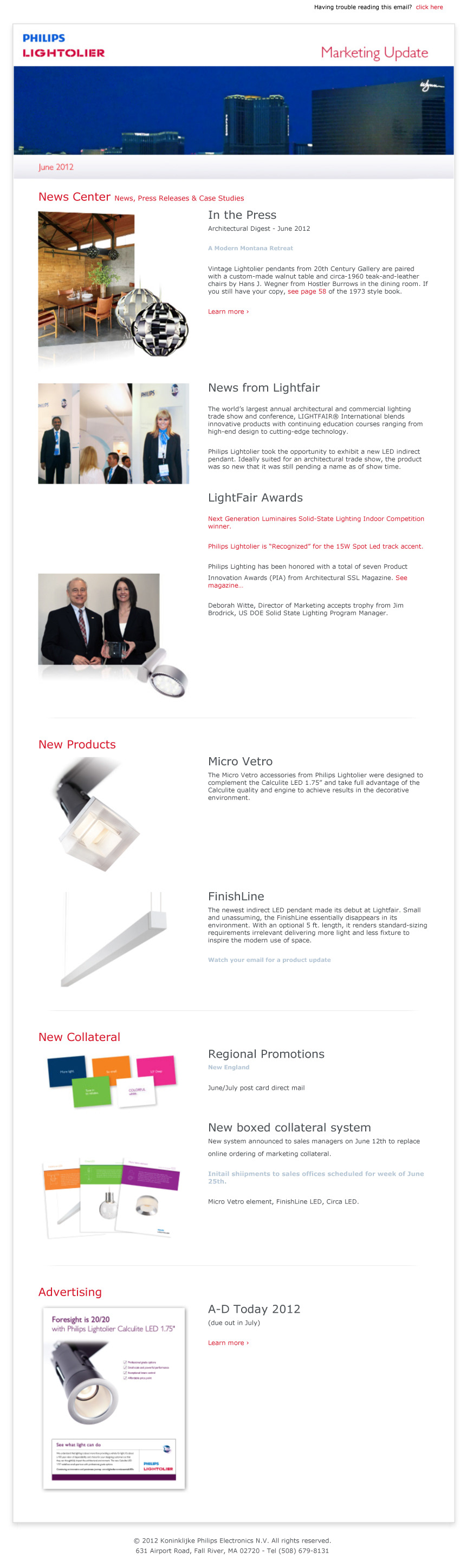 This project showcases some of the e-marketing I had created for Philips. They show the smaller email blasts to the larger e-newletters. They went out to a large audience.